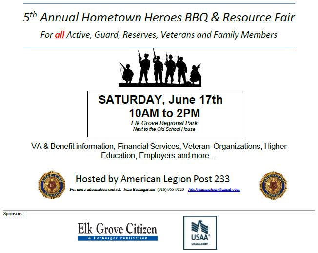 Please join your local veterans at the 5th Annual Hometown Heros BBQ and Resource Fair. For more information, please contact Julie Bumgartner at 916-955-9520 or by email.